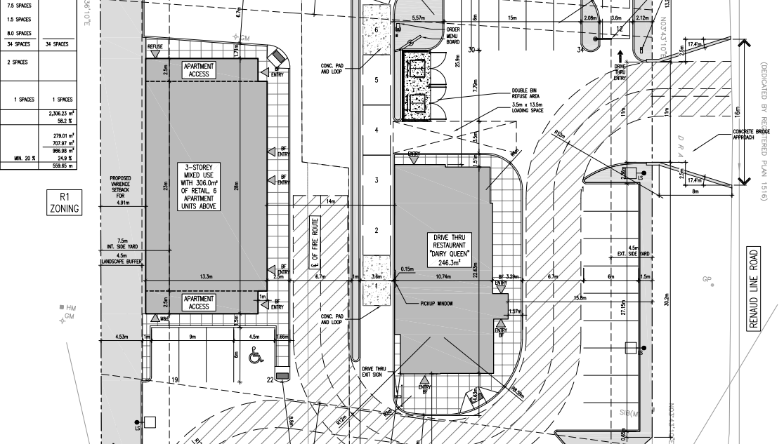 The Dairy Queen will have a drive-thru, and the mixed-use building will have the main floor be commercial space, with two upper storey's consisting of six residential units.