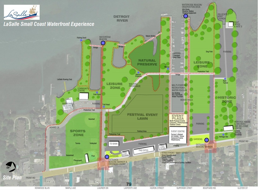 The project in the area of Front Road and Laurier Drive would include a mix use of indoor and outdoor space, a walkable parkland, a 30,000 square foot event centre at the former Westport Marina site, splash pads, and a sports zone.