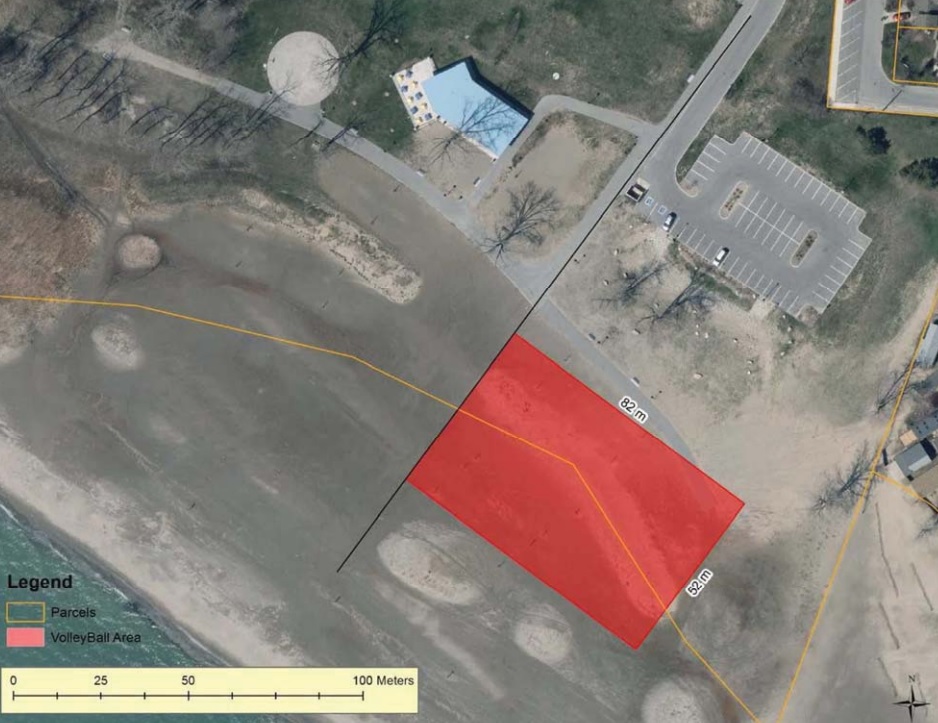 An overview of Seacliff Beach in Leamington outlining the volleyball area and available space on the shoreline. (Photo courtesy Municipality of Leamington)