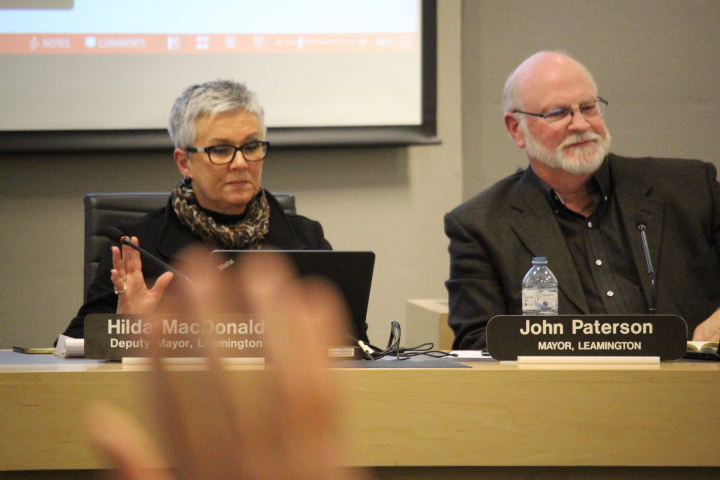 Leamington Mayor John Paterson (right) and Deputy Mayor Hilda MacDonald (left) attend the 2017 budget meeting for the county on February 1, 2017. (Photo by Ricardo Veneza)