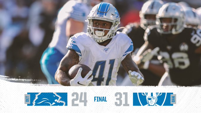 Stafford moved Detroit down to the one yard line in the closing seconds. On the Lions final play, he threw the ball up for tight end Logan Thomas but Raiders' defensive back Karl Joseph broke it up.