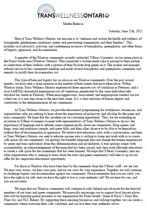 "This is a clear example of the dehumanization that is experienced by trans and queer individuals so often," they said. "Part of our role here at Trans Wellness Ontario is to challenge these instances and to raise awareness when they happen."