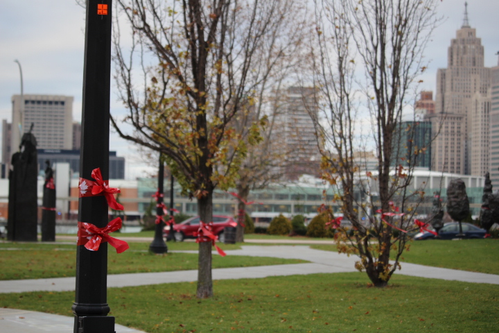 Ealier this week, 30 students from Riverside High School and members of the Windsor Aquatic Club tied red ribbons around trees and light posts surrounding the WFCU Centre and the Windsor Aquatic Centre.