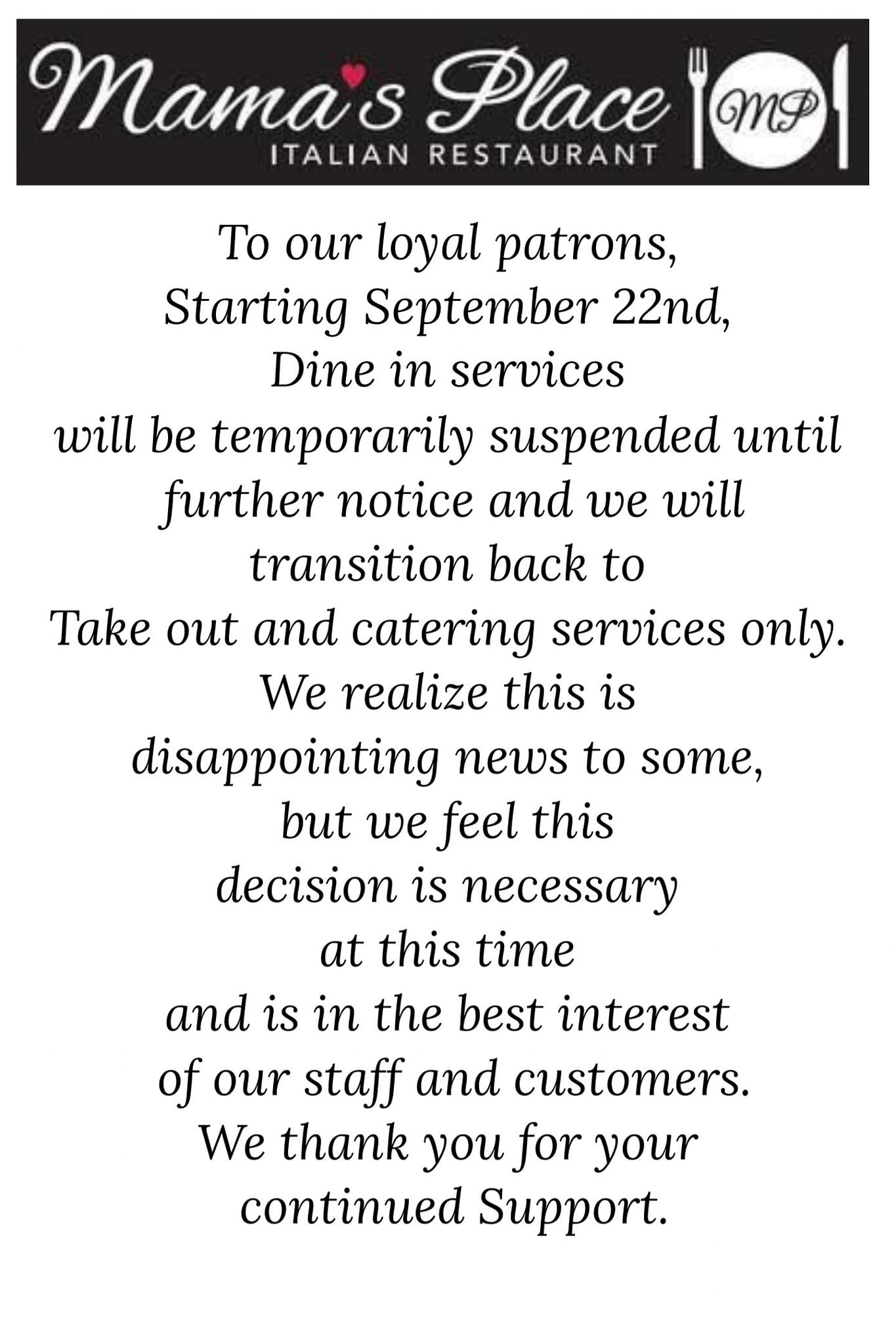 Mama's Place Italian Restaurant posted its takeout/catering decision on Faceback on Thursday, September 16, 2021