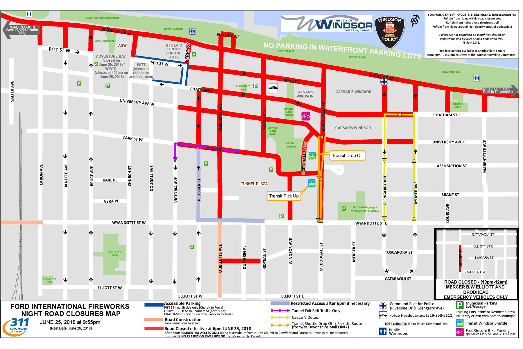 A free Transit Windsor bus service will operate from Devonshire Mall to downtown from 6pm until approximately 9:30pm. Return bus service will commence at the conclusion of the fireworks.