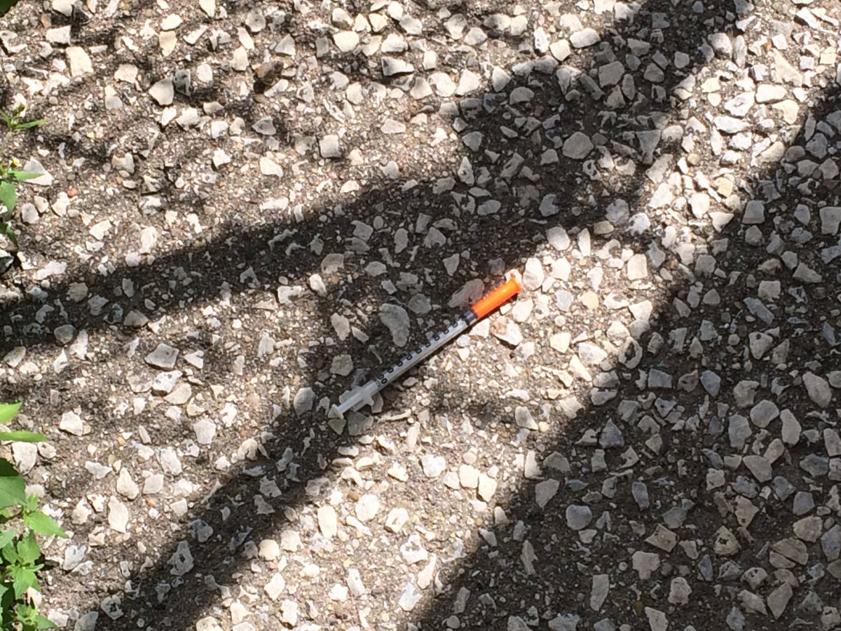 A needle is found outside of the former HMCS Hunter building (Photo by AM800's Rob Hindi)