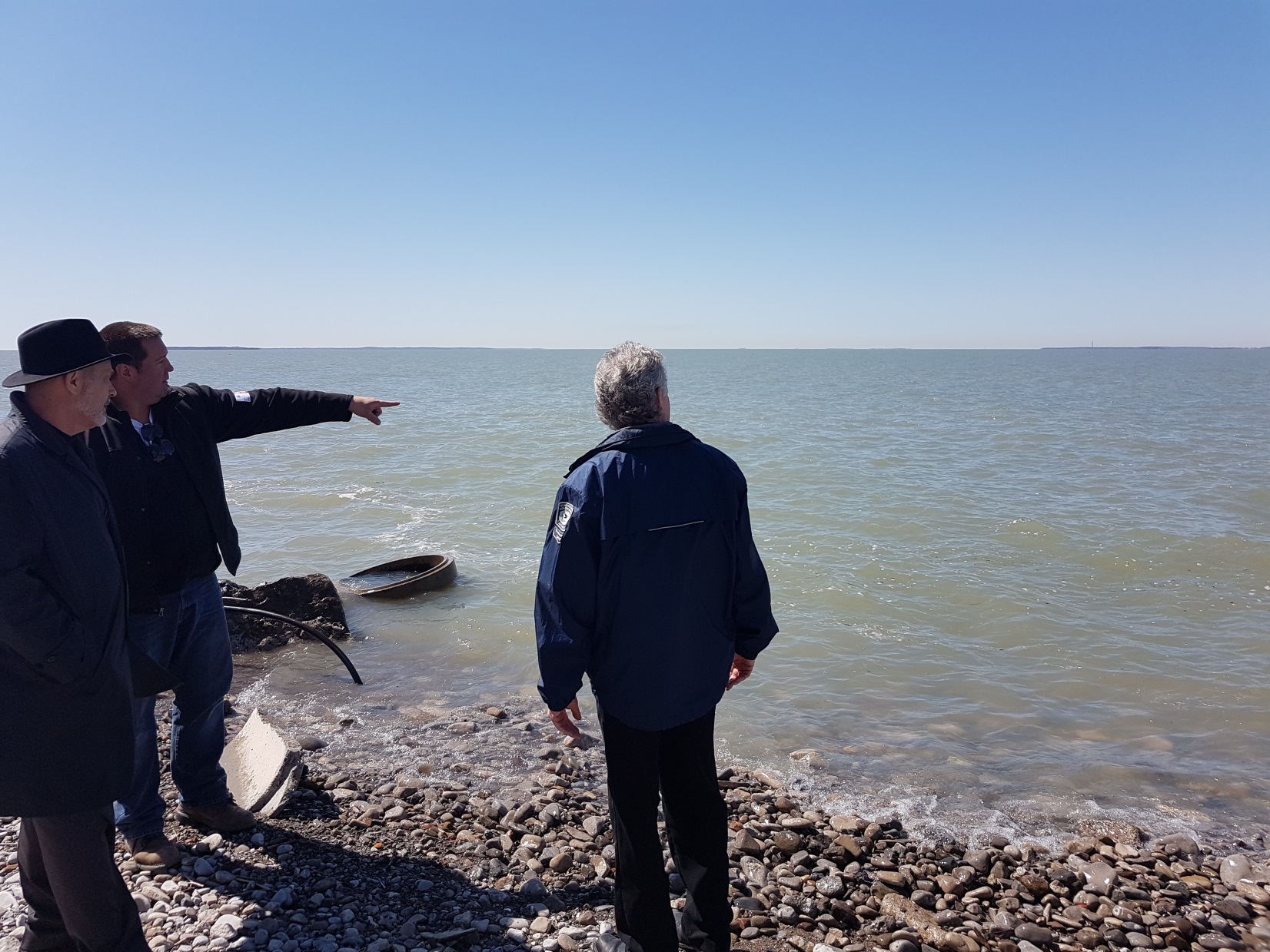 : Dave DeLellis (Deputy Mayor, Pelee Island) is showing Dave Van Kesteren (MP Chatham-Kent—Leamington) and Tim Byrne (Director, Watershed Management Services, ERCA) the broken household water supply crock, and were the west shoreline is actively being destroyed, April 20, 2018 (Photo courtesy of the Office of Dave Van Kesteren, MP)