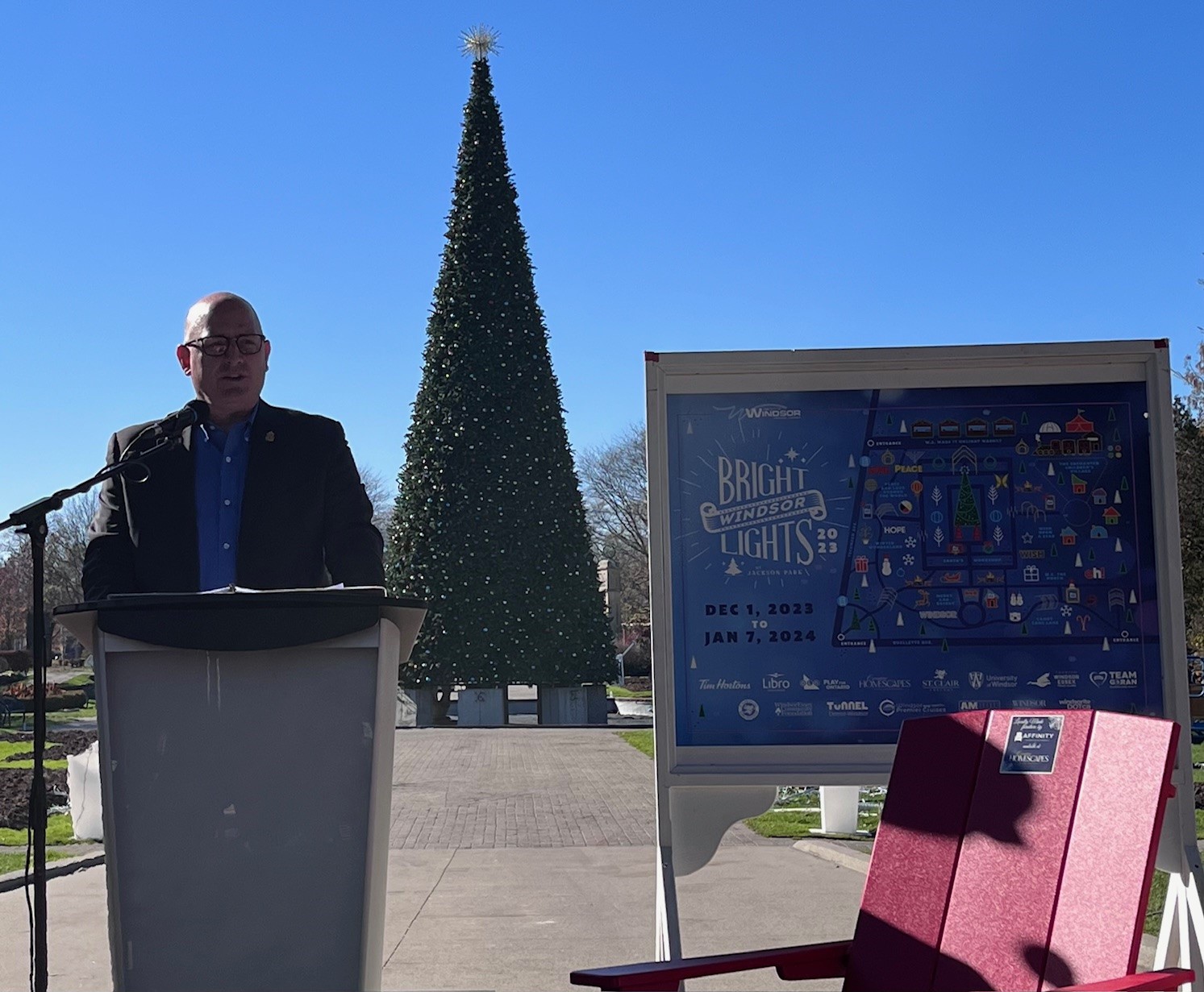 Windsor Mayor Drew Dilkens announces the list of features for Bright Lights Windsor in Jackson Park. Nov. 15, 2023. (Photo: Rusty Thomson)