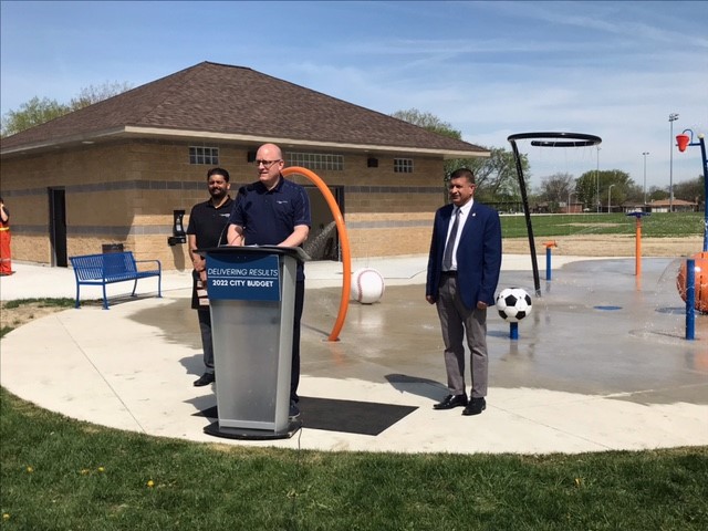Windsor Mayor Drew Dilkens (at podium), Ward 7 Councillor Jeewen Gill (right) and James Chacko, Executive Director of Parks and Facilities for the City of Windsor (left) announce the opening of a new splash pad and fully accessible washroom facility in Forest Glade Park. May 12, 2022 (Photo by Rusty Thomson)