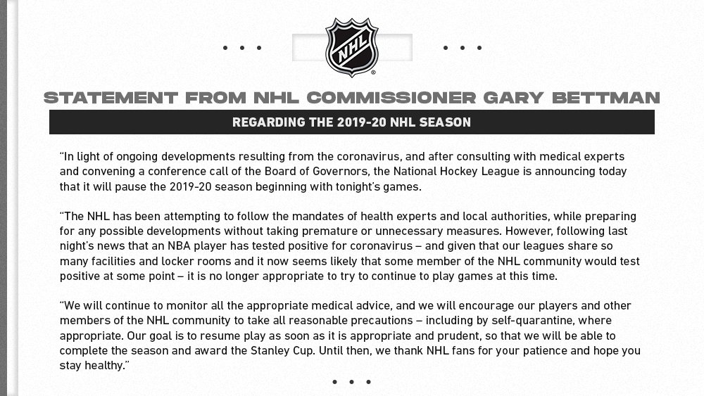 The NHL has suspended the regular season effective immediately because of COVID-19.