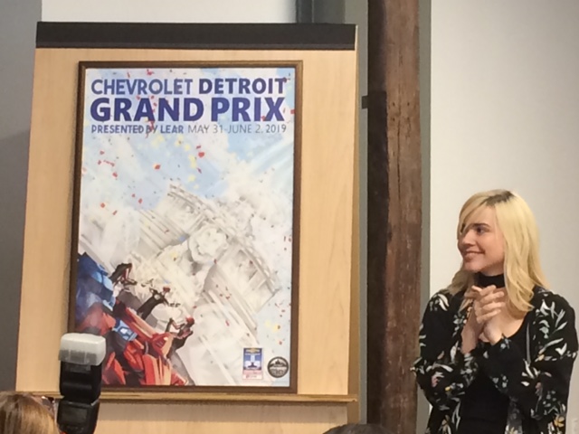 Official 2019 Detroit Grand Prix poster with artist Ali Feedak, Lear Innovation Centre, April 30, 2019 (by AM800's Peter Langille)