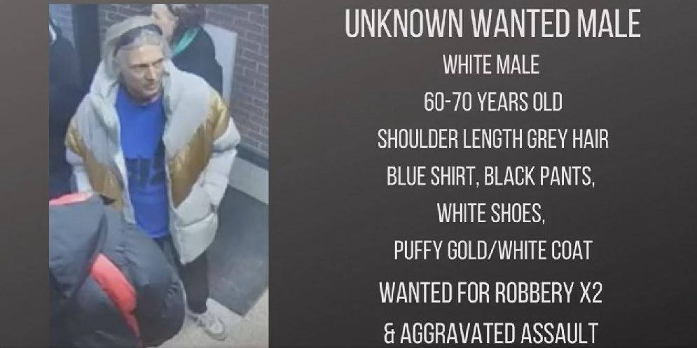An unidentified male suspect is wanted on charges of aggravated assault and two counts of robbery. He's described as white, approximately 50-60 years old, with long grey hair. At the time of the incident, he wore a white and gold puffy jacket, blue shirt, black pants, and white shoes.