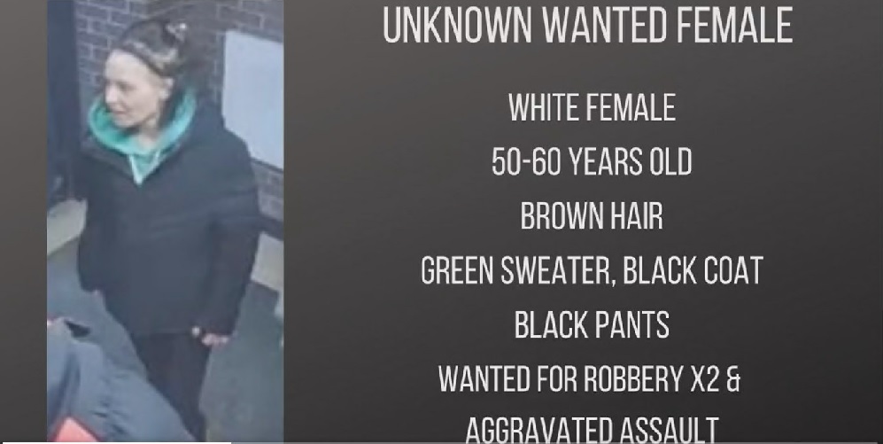 An unidentified female suspect is wanted on charges of aggravated assault and two counts of robbery. She is white, approximately 30-40 years old, with brown hair. At the time of the incident, she wore a dark winter coat with a greenish hoodie, black pants and brown shoes.