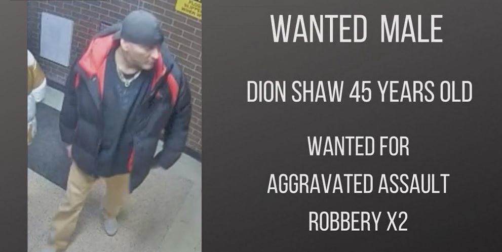 45-year-old Dion Shaw is wanted on charges of aggravated assault and two counts of robbery. He's described as white, approximately 6'6 tall, with a medium build, short brown hair, and a goatee.