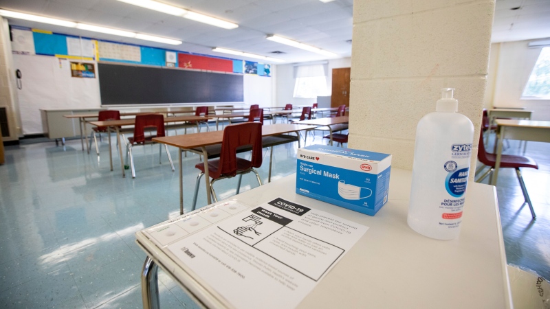 A physically distanced classroom with masks and hand sanitizer is seen at Kensington Community School amidst the COVID-19 pandemic on Tuesday, September 1, 2020. THE CANADIAN PRESS/Carlos Osorio