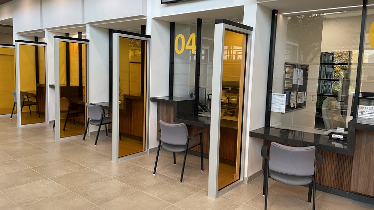 The Welcome Centre includes services for students such as the Registrar's office, Financial Aid, International Student Office and Academic Advising for students all in one space, with a new queuing system, seating areas, and added stations.