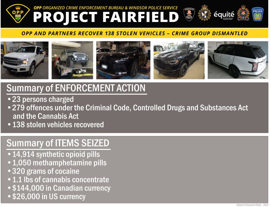 Project FAIRFIELD was initiated by Windsor Police Service in April 2022 and joined by the Ontario Provincial Police Organized Crime Enforcement Bureau West in September 2022. The investigation also included the Canada Border Services Agency, the London Police Service, the Peel Regional Police and Équité Association.