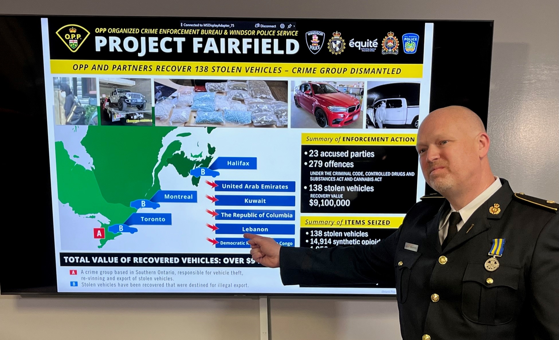 A graphic showing the scope of Project FAIRFIELD, a joint police force investigation into an international auto theft ring based in the Windsor area. Aug. 3, 2023. (Photo: Ontario Provincial Police)