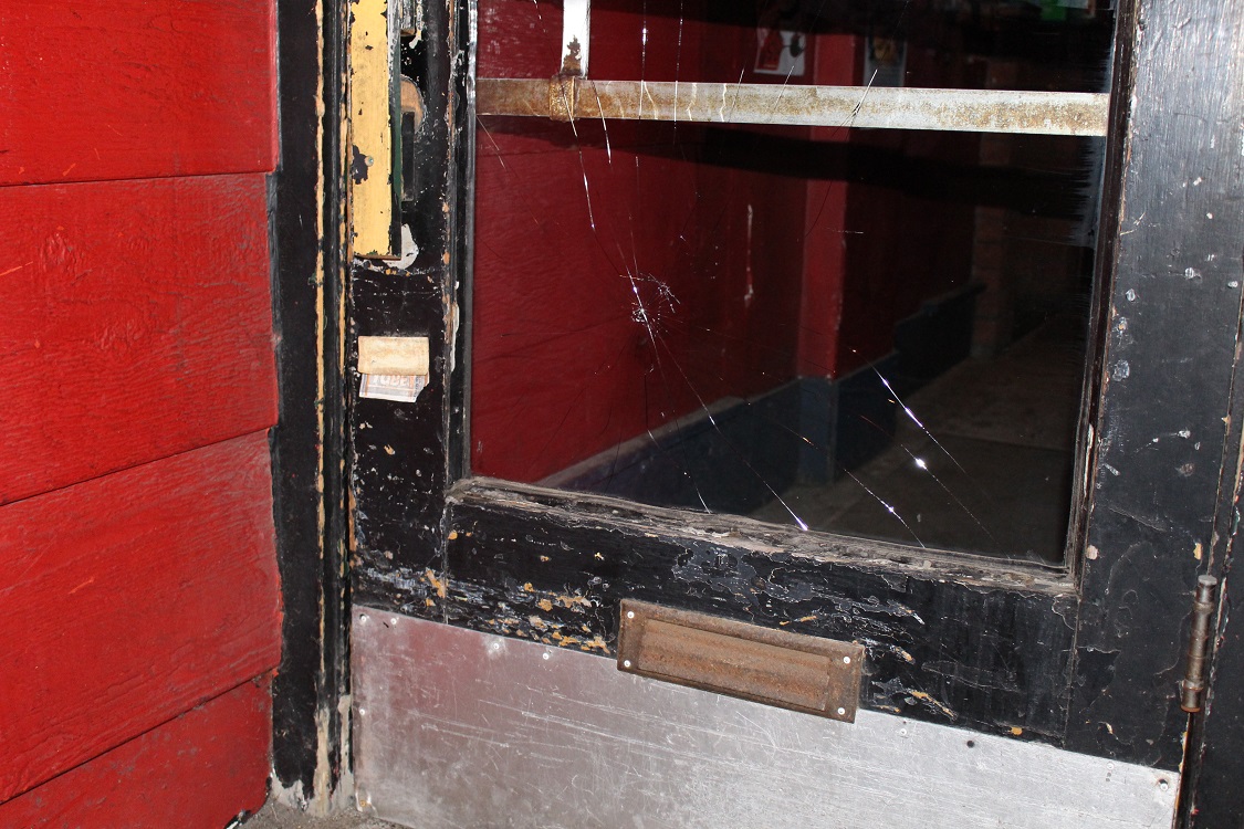 The glass of the door to the Phog Lounge in downtown Windsor is cracked by an apparent rock throwing. Photo taken September 4, 2018. (Photo by Ricardo Veneza)