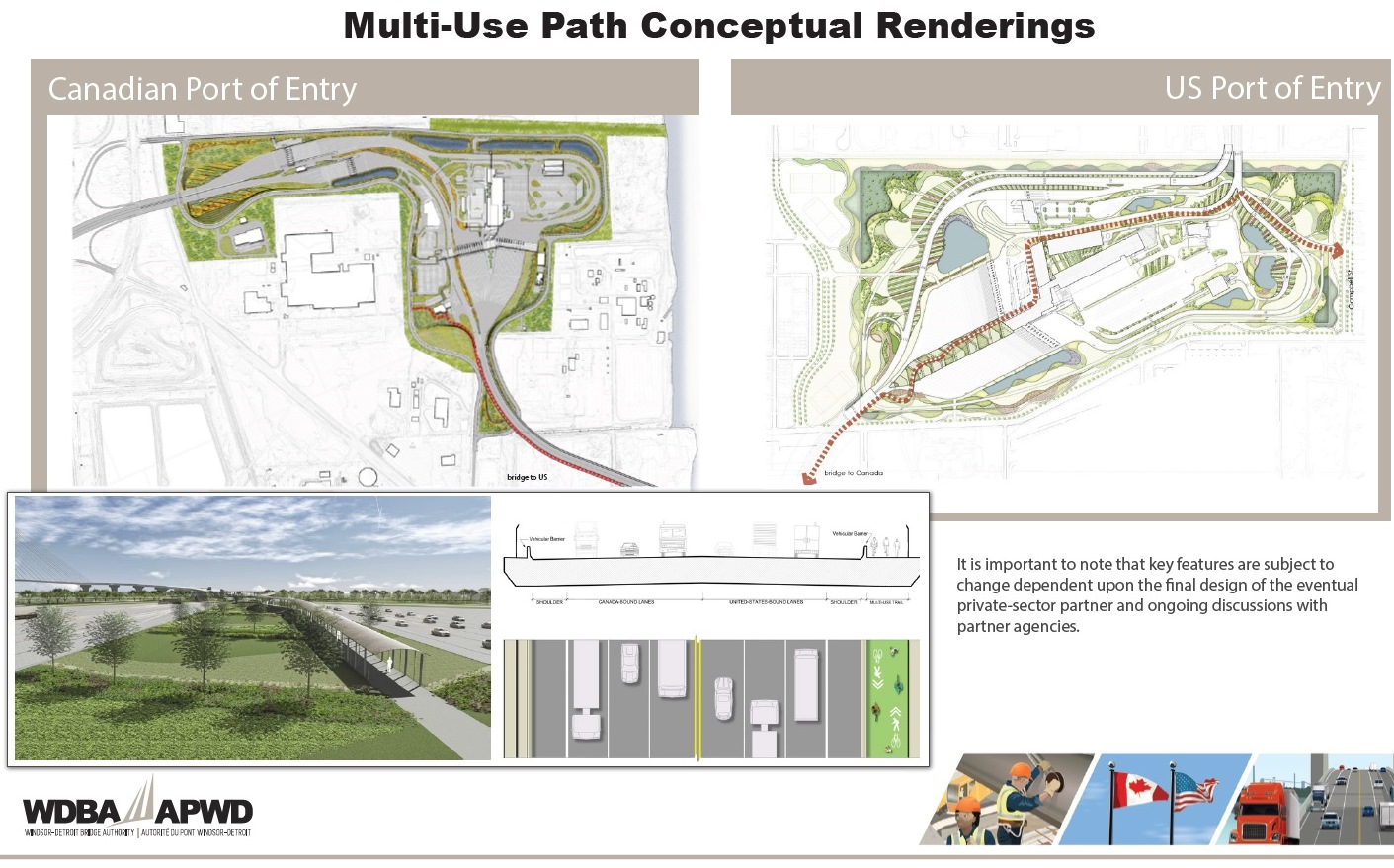 Planned pedestrian path layouts for the Gordie Howe International Bridge. (Photo courtesy of the Windsor-Detroit Bridge Authority)