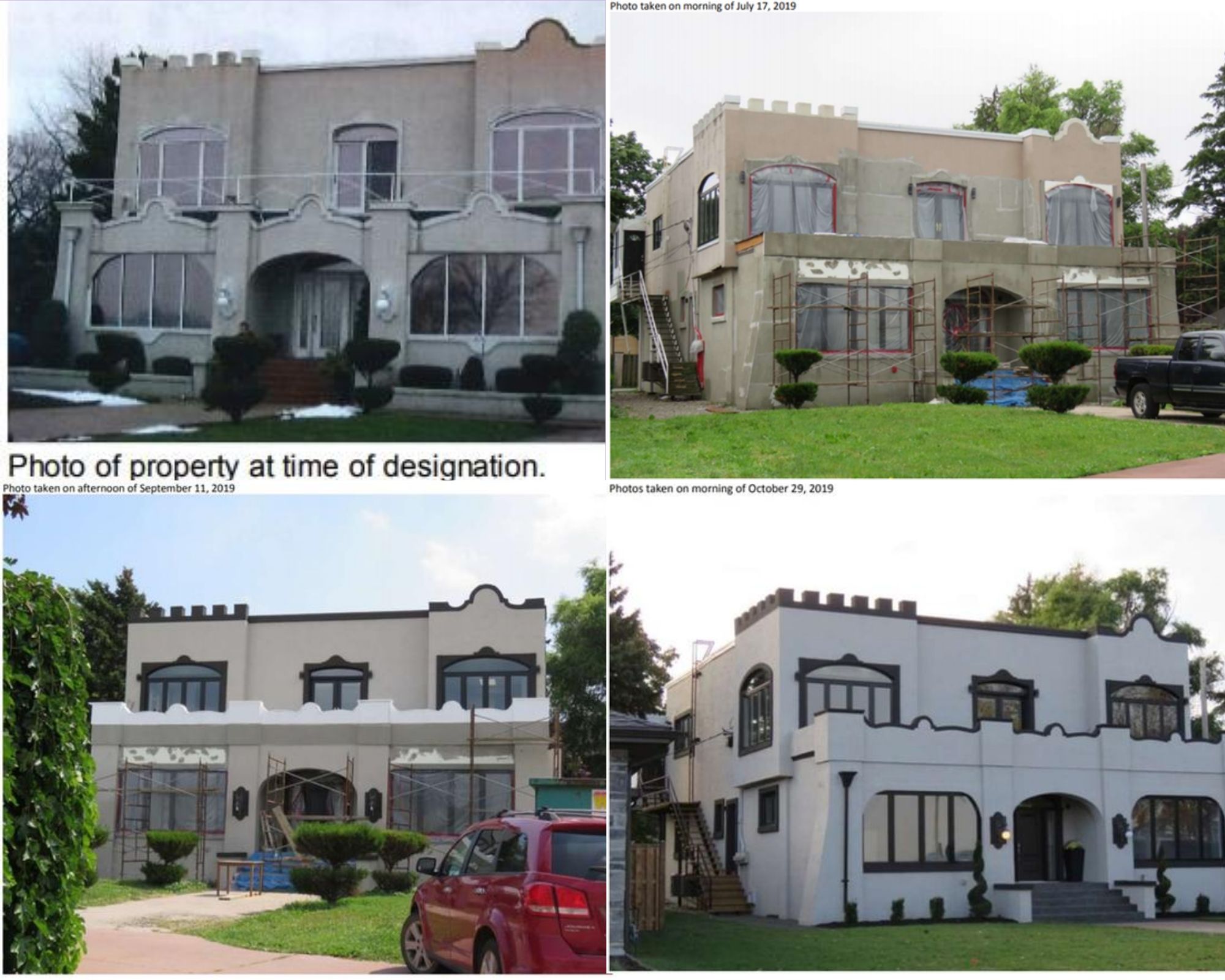 A photo showing what the home looked like at the time of designation in 2012 (top left), under construction in July 2019 (top right), under construction in September 2019 (bottom left) and the completed project in October 2019 (bottom right). Images courtesy of the City of Windsor.