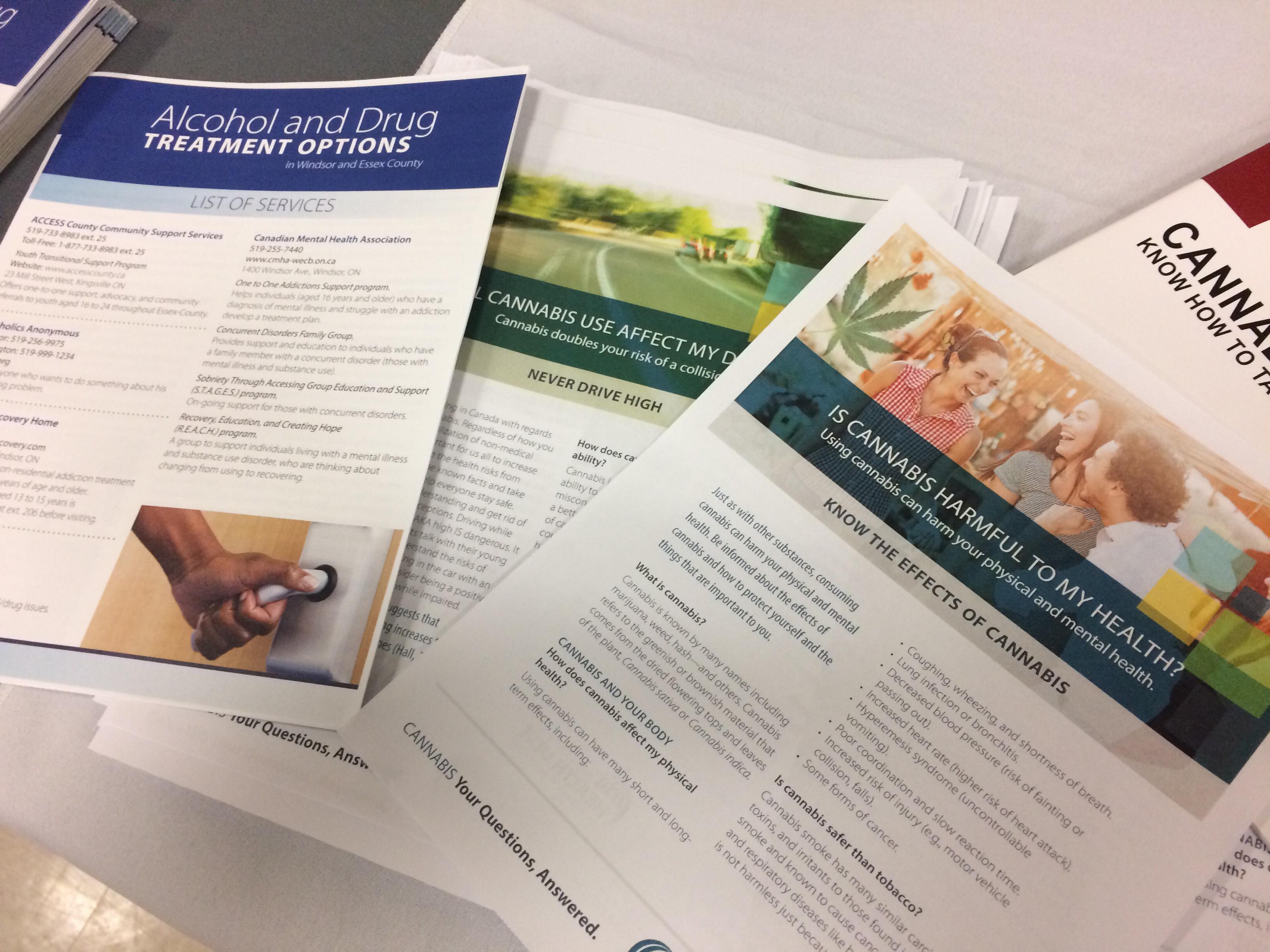 Windsor-Essex County Health Unit literature available at a public meeting on retail cannabis stores in Amherstburg (Photo by AM800's Zander Broeckel)