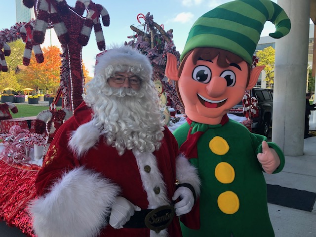 Ward 3 city councillor Renaldo Agostino, members of the Windsor Parade Corporation, Santa Claus and one of his elves stand outside of Windsor city hall, October 18, 2023 (Photo by AM800's Rob Hindi)
