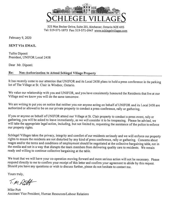 Unifor Local 2458 has been put on notice by Schlegel Villages.