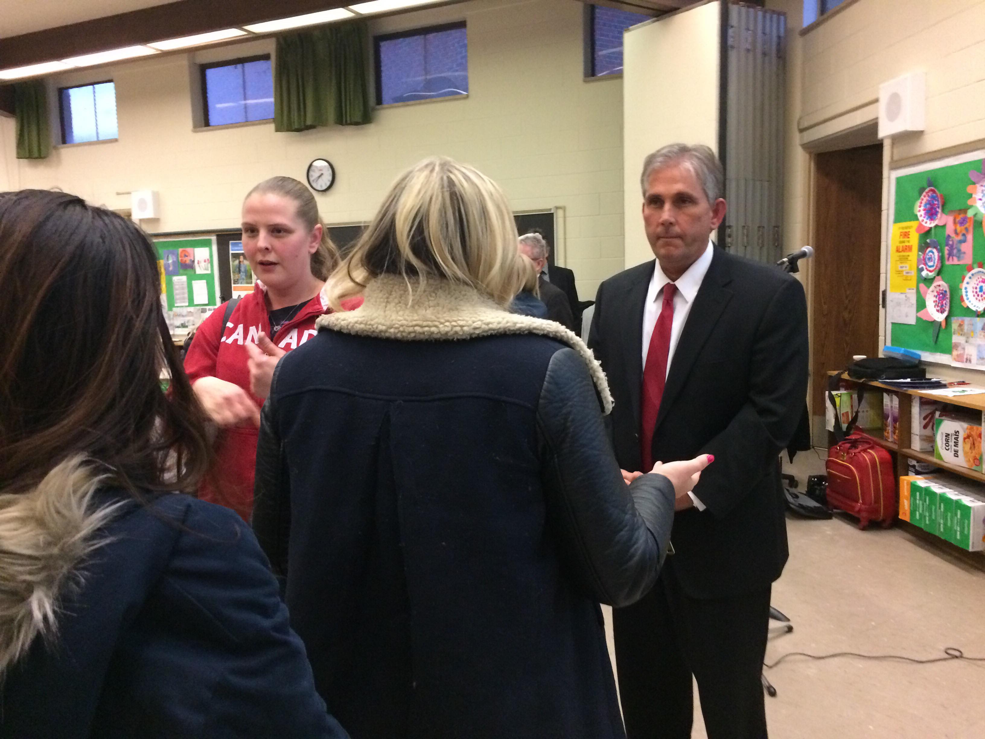 Public School Superintendent of Education Todd Awender discusses school boundary changes with parents (Photo by AM800's Zander Broeckel)