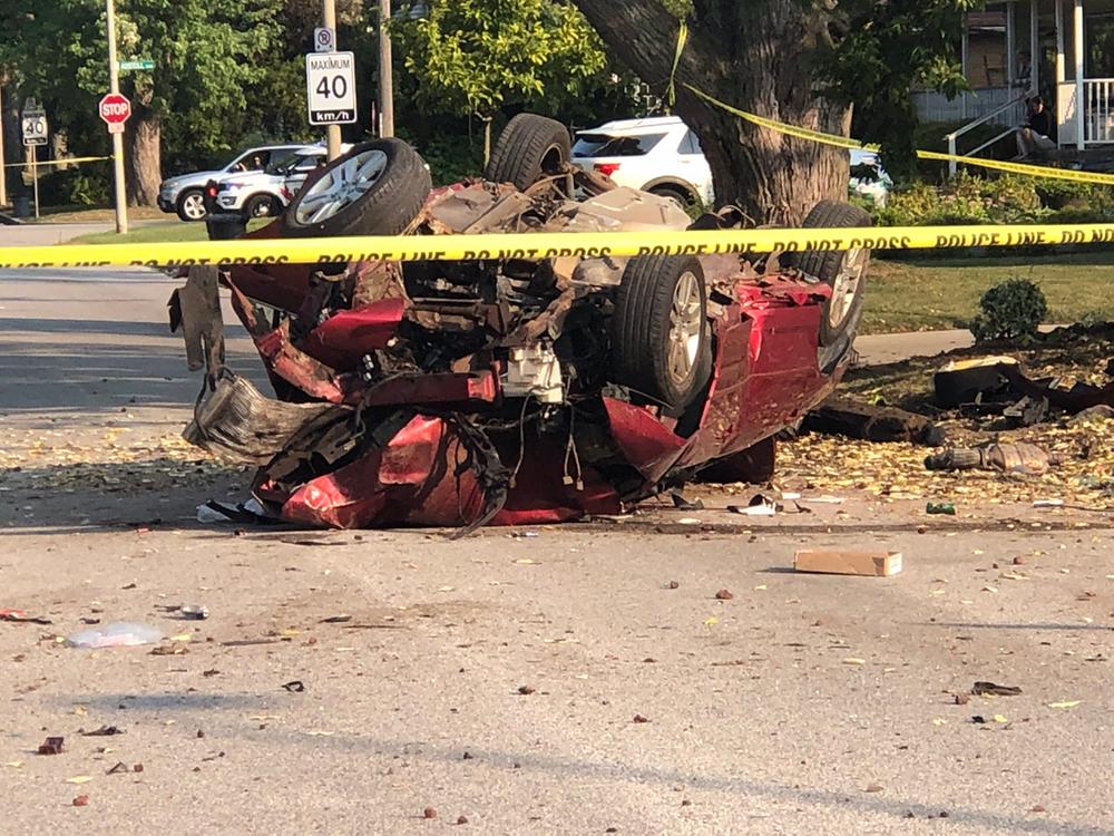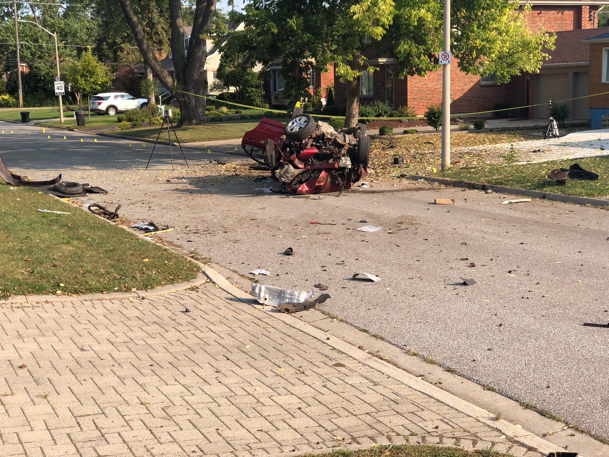 A car is badly wrecked after a single vehicle crash on Princess Ave. in Windsor, September 15, 2022 (AM800 News)
