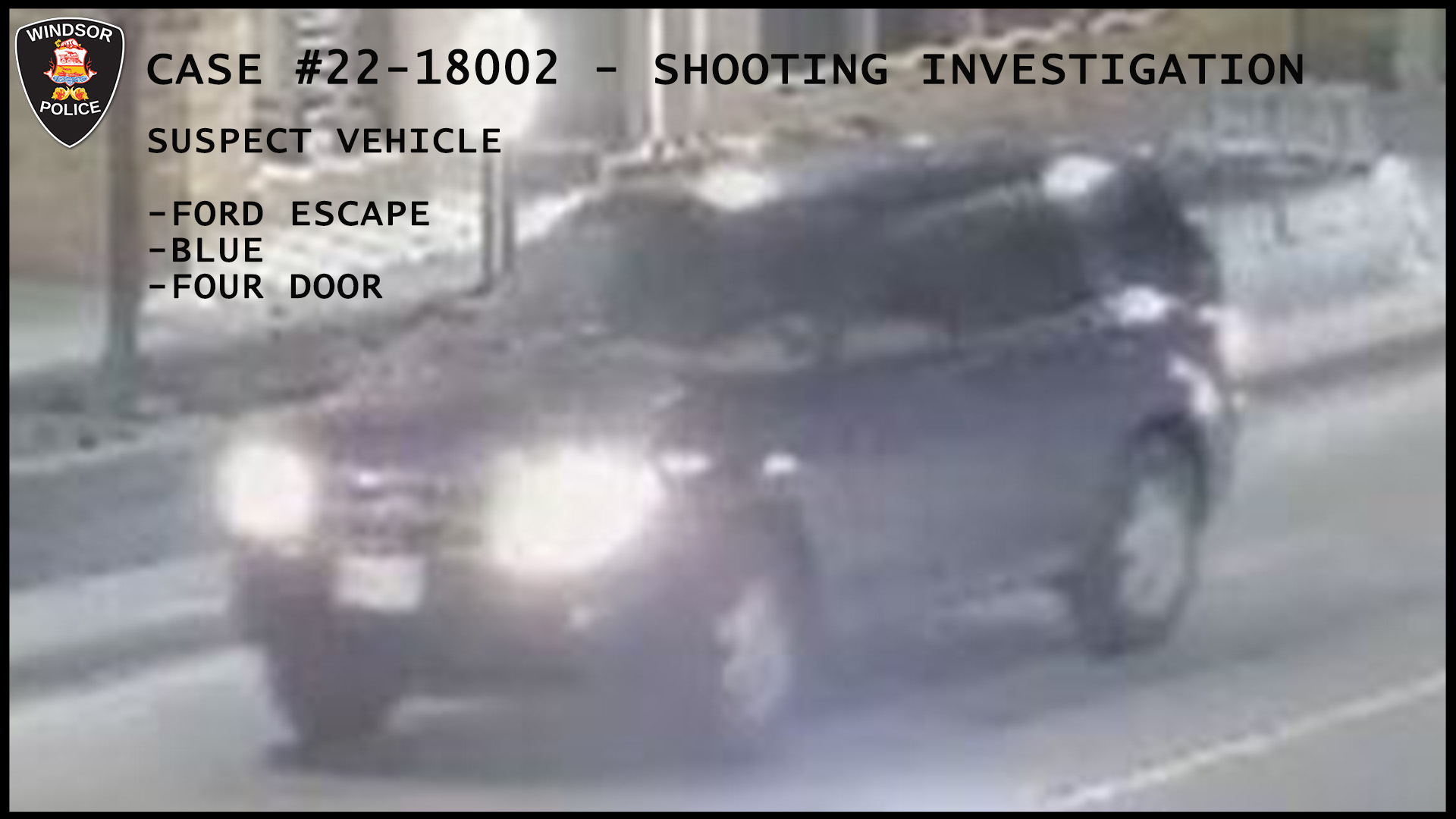 The suspect vehicle was captured on surveillance video travelling westbound on Wyandotte Street West and turn southbound on Rankin Avenue. Investigators are asking anyone with surveillance cameras in the area to check their video for possible evidence, including further footage of the vehicle.