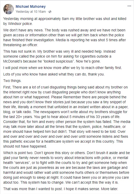 A posting by Michael Mahoney, the brother of Matthew Mahoney, identified as the victim of a Windsor Police involved shooting on March 21, 2018. (Photo via Michael Mahoney's Facebook page)