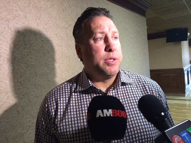 Windsor Spitfires GM Warren Rychel fields questions about meeting with his players (photo by AM800's Peter Langille)