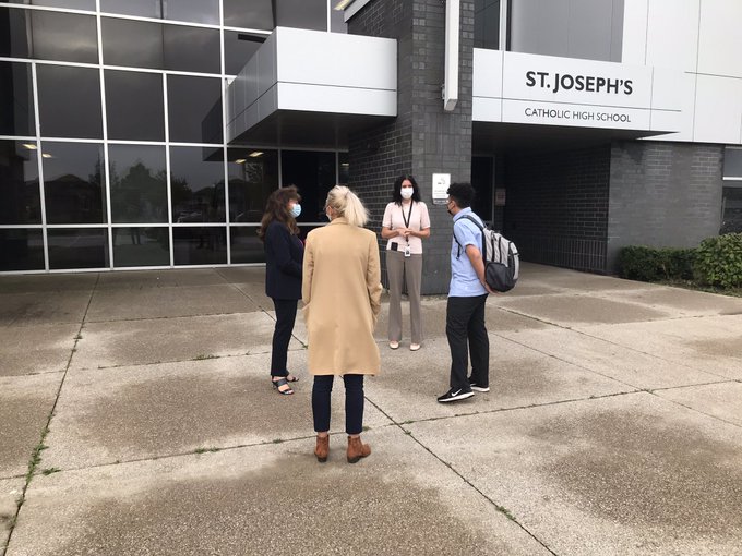 WECDSB staff along with health unit CEO Nicole Dupuis welcome students back to St. Joseph's Catholic High School, September 23, 2021 (Photo by AM800's Rob Hindi)