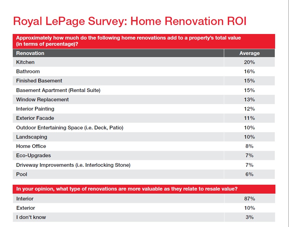 Royal LePage surveyed 340 real estate professionals across the country as part of the return on investment report, which also found a bathroom renovation could increase a home's value by 16 per cent.