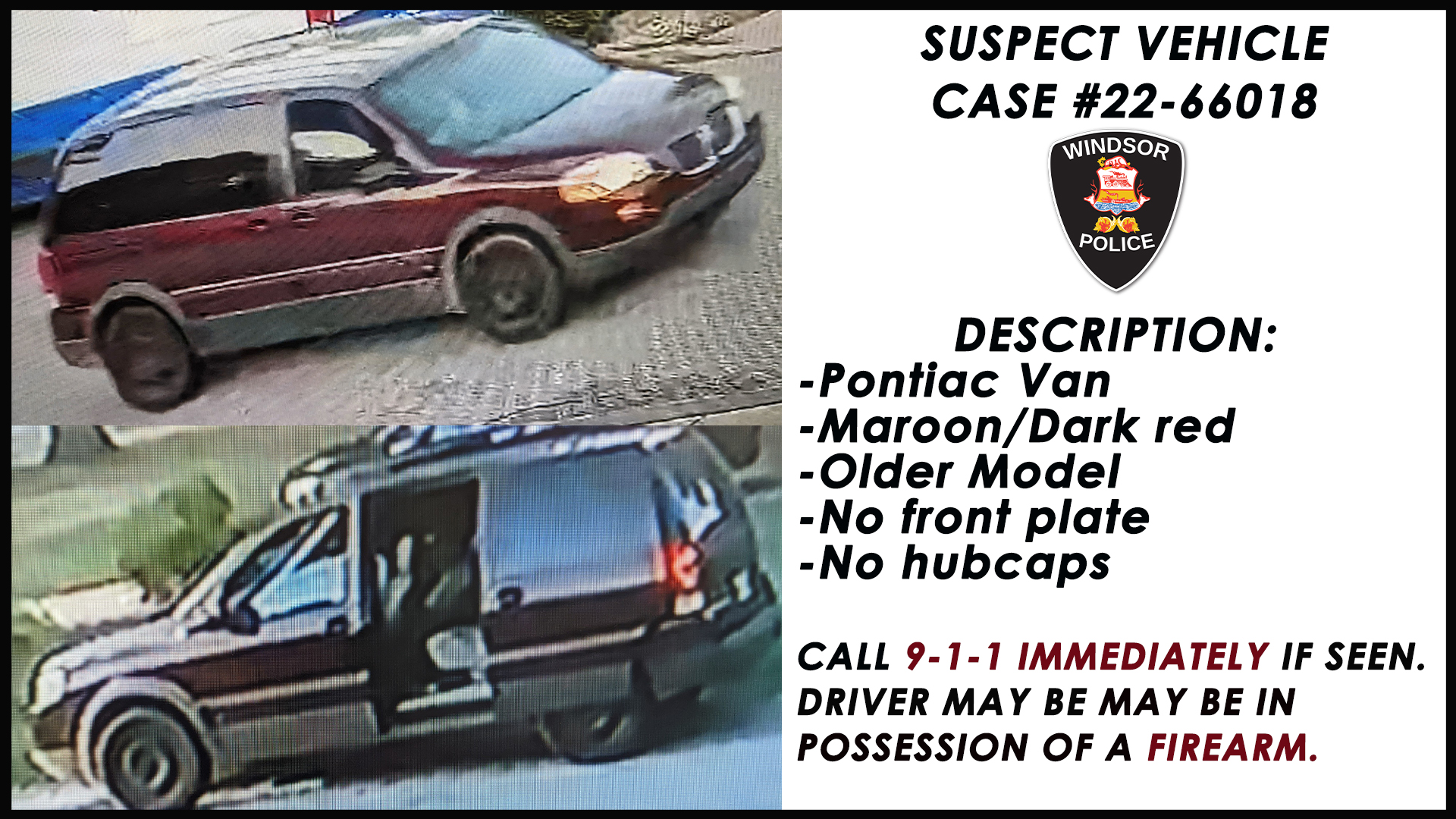 The vehicle involved in the case remains outstanding and is described as an older model Pontiac van, maroon/dark red in colour, no hubcaps, and no front licence plate.