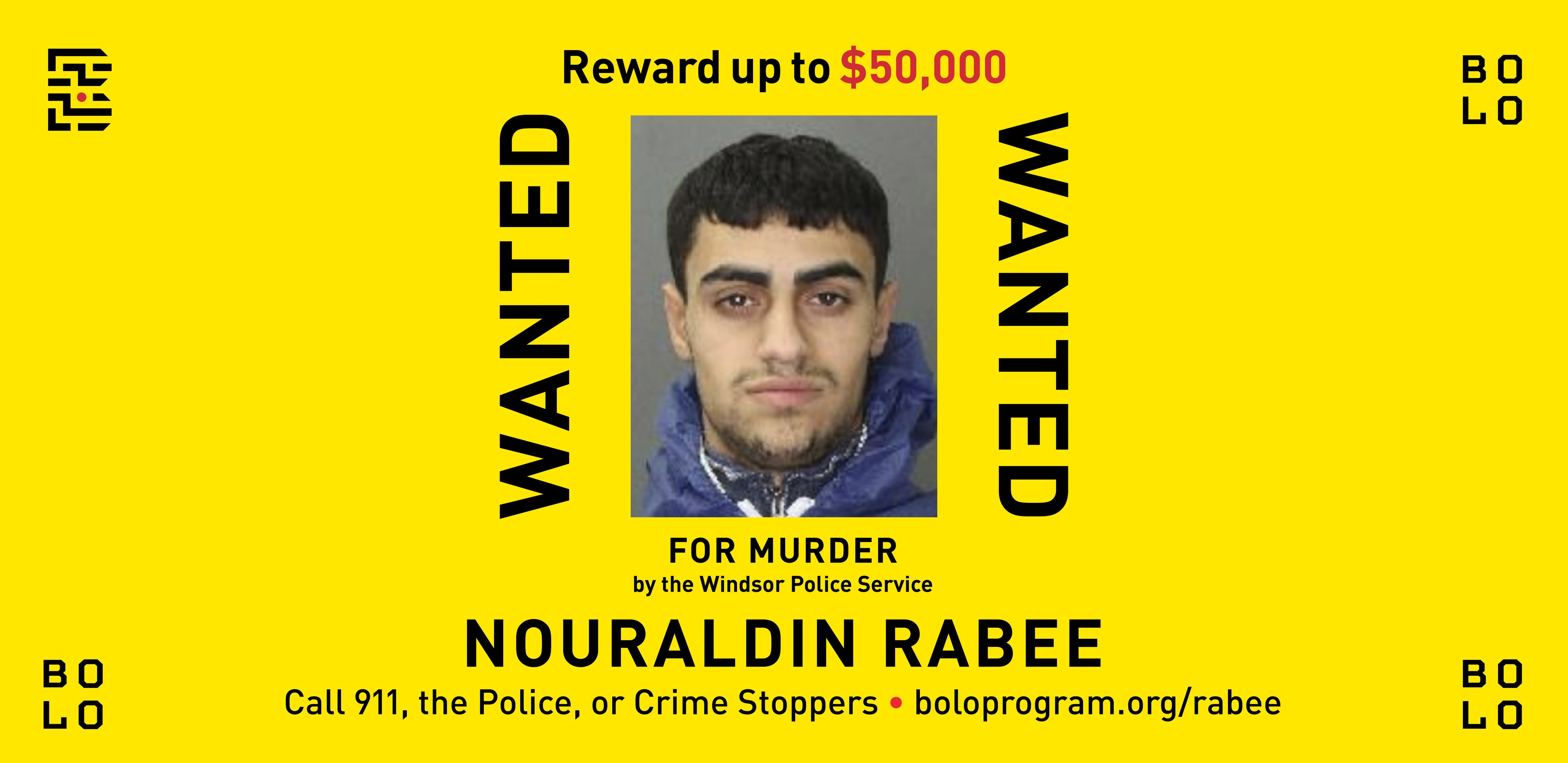 Nouraldin Rabee is currently wanted by the Windsor Police Service on a Canada-wide warrant for first-degree murder, kidnapping, and forcible confinement. An INTERPOL Red Notice has been issued for him.