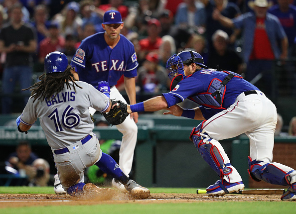 Freddy Galvis of the Toronto Blue Jays is tagged out at home by Jeff Mathis of the Texas Rangers in the eighth inning at Globe Life Park in Arlington on May 03, 2019 in Arlington, Texas. (Photo by Richard Rodriguez/Getty Images)