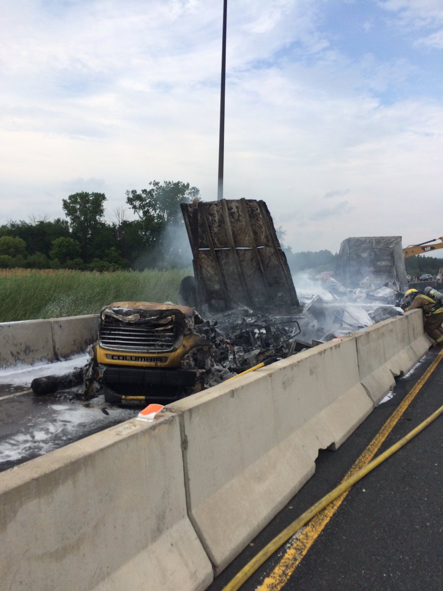 Police say the truck then turned and struck the centre barrier pushing it into the eastbound lanes and the tractor trailer caught fire.