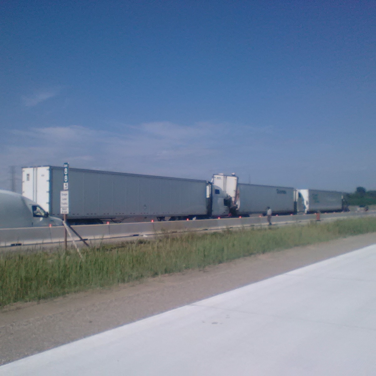 A chain reaction crash involving three transport trucks creates long delays on Hwy. 401 through Chatham on August 10, 2017. (Photo courtesy OPP)