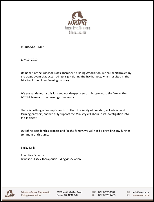Statement from the Windsor Essex Therapeutic Riding Association, July 10, 2019