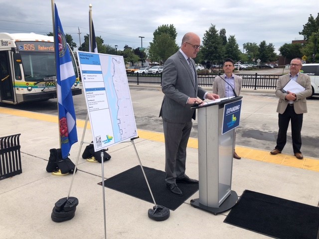 Windsor Mayor Drew Dilkens, Amherstburg Mayor Aldo DiCarlo, and Transit Windsor Executive Director Tyson Cragg were at the Hôtel-Dieu Grace Healthcare Bus Terminal Tuesday morning to make the announcement and officially launch the first trip from Windsor to Amherstburg.