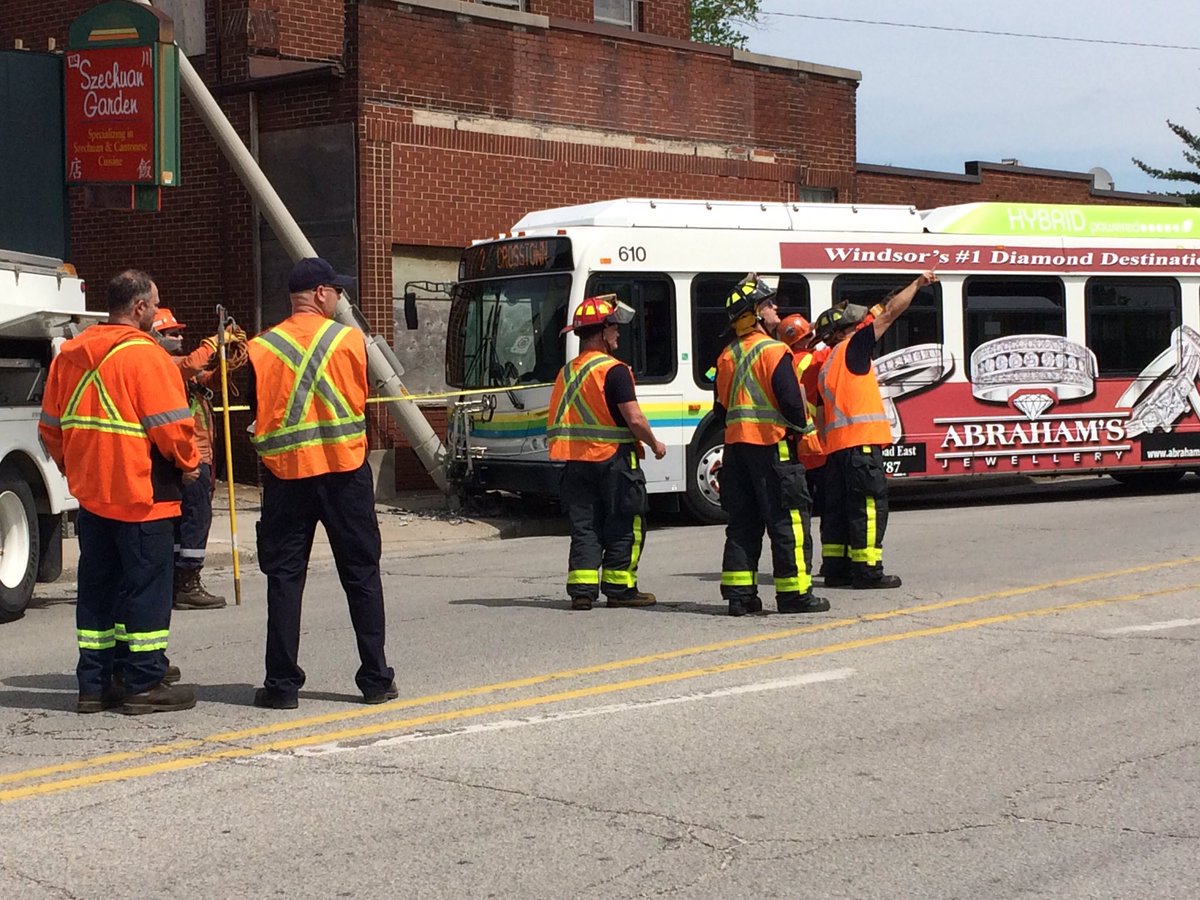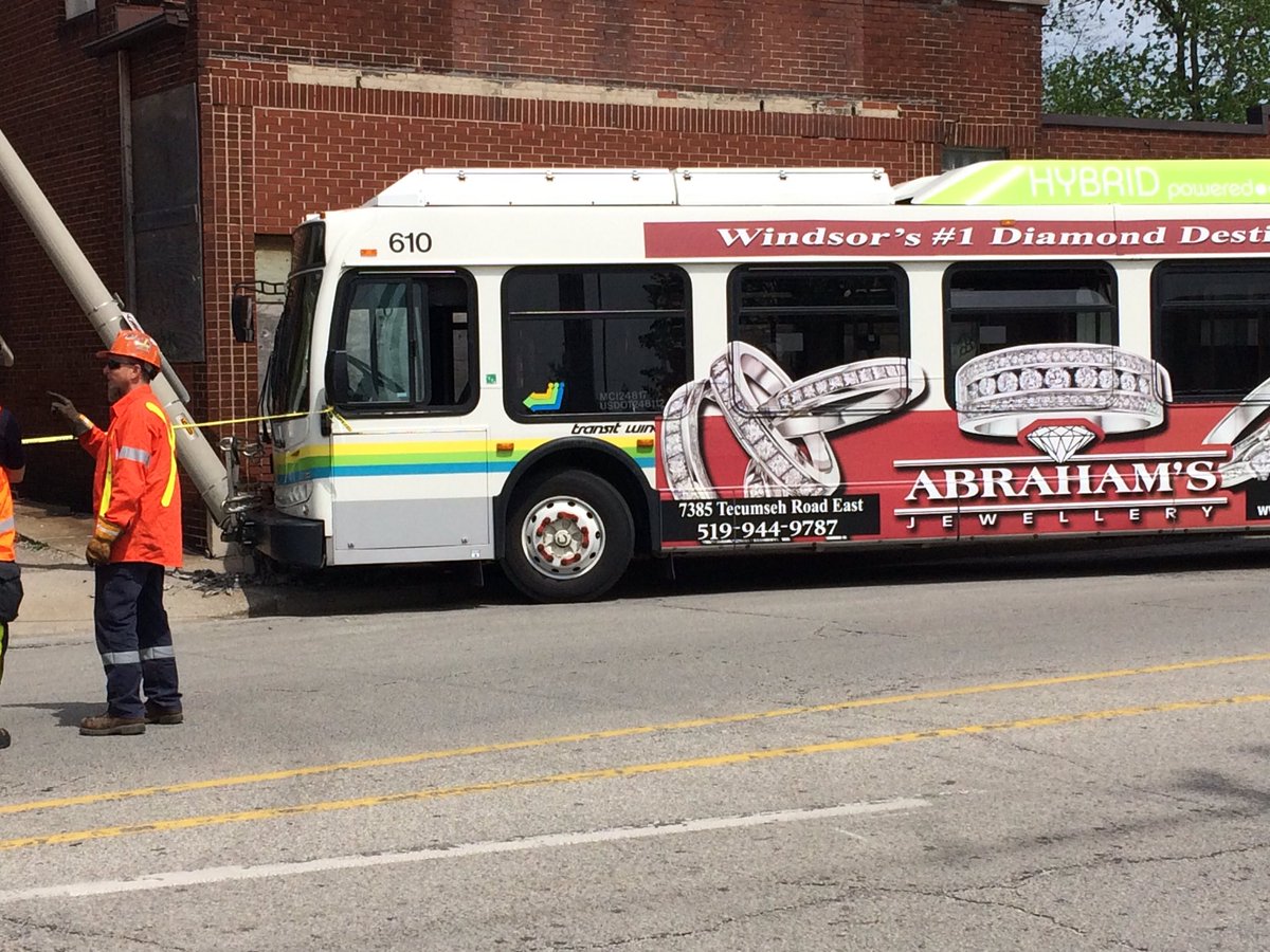 The bus ran off the road at Crawford Ave. and Wyandotte St. W. just after 11:30am, jumping the curb and striking a light pole.