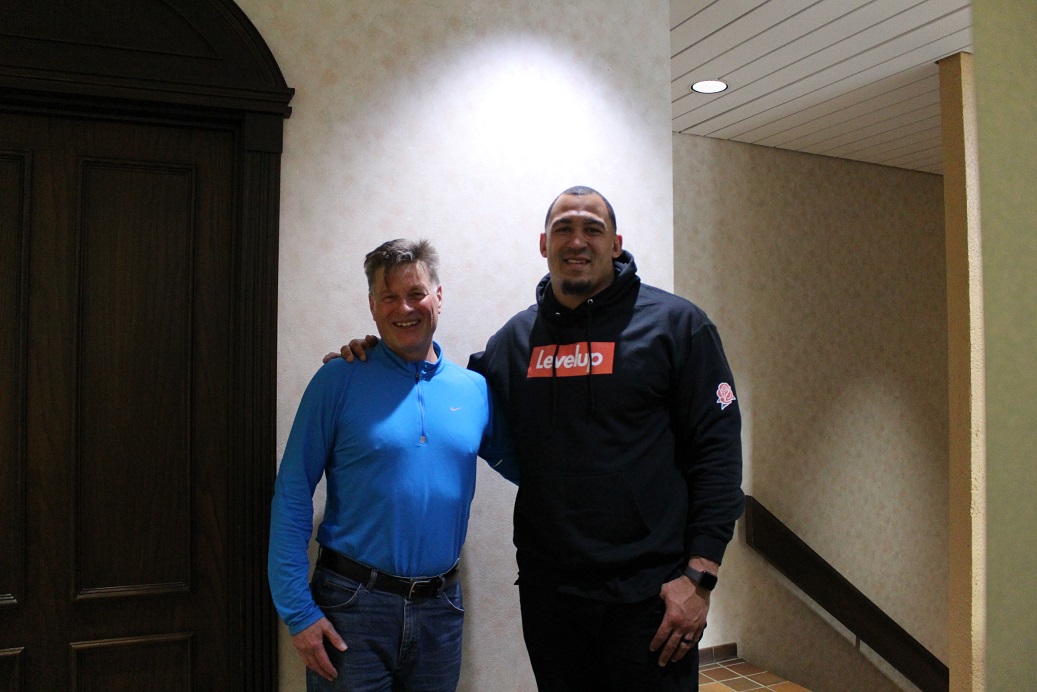AM800 Sports Director Steve Bell with Dallas Cowboys Defensive End, Tyrone Crawford at Bell Media Radio, April 5, 2018 (Photo by AM800's Kristylee Varley)