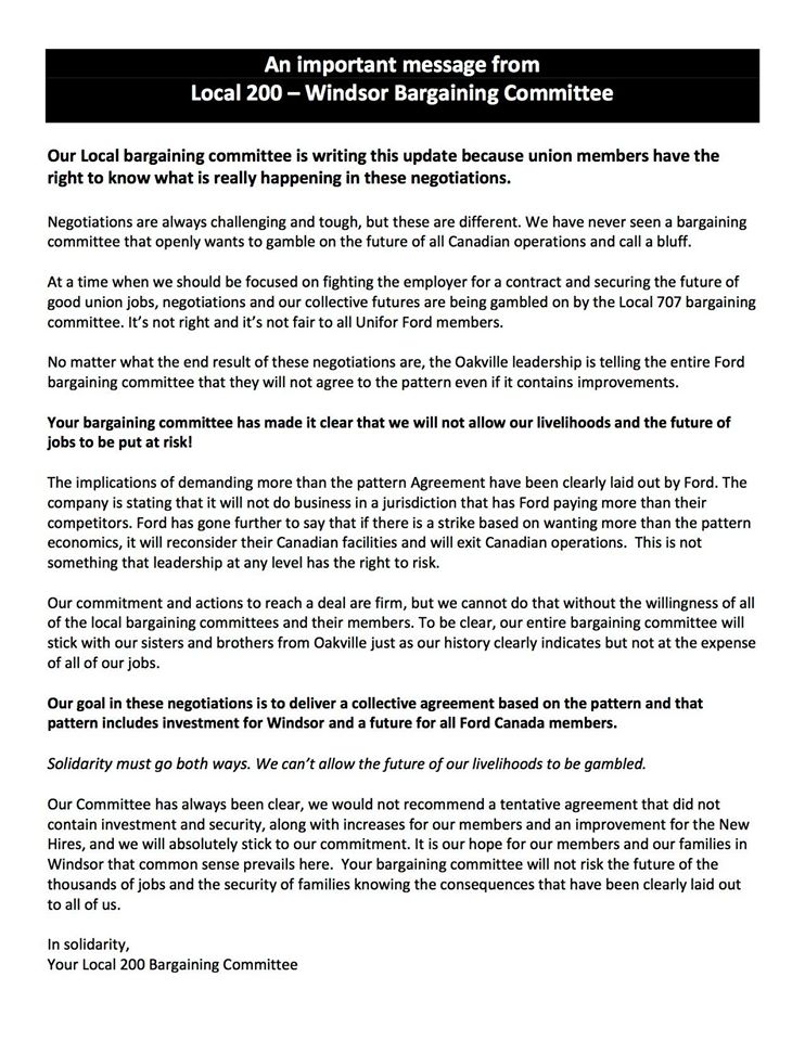 Unifor Local 200 in Windsor has released a statement, condemning the bargaining committee for Local 707, representing workers at the Ford Assembly Plant in Oakville.