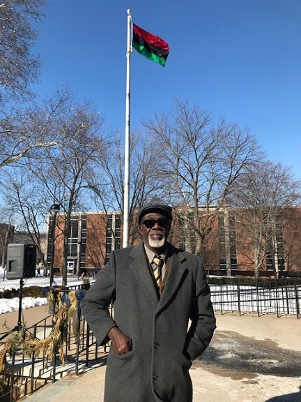 Dr. Clinton Beckford, Vice-President of Equity, Diversity and Inclusion at the University of Windsor, stands in front of the Pan-African flag during a ceremony to honour the start of Black History Month. Feb. 1, 2023 (Photo Credit: Courtesy of AM800's Rob Hindi)