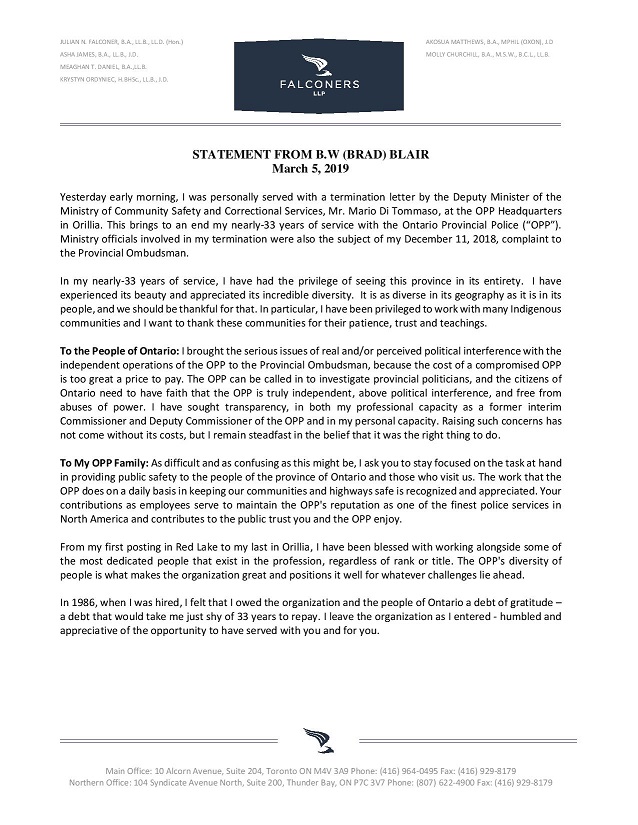 Brad Blair's statement released through his lawyer after being fired as OPP Deputy Commissioner, March 5, 2019. (Statement courtesy of Falconers LLP)