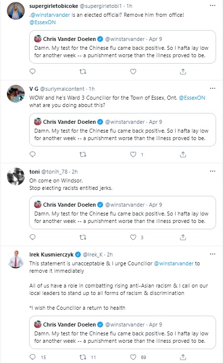 As an Essex Town Councillor and former columnist with The Windsor Star, his comments have a very real and damaging impact on Asian Canadian communities. We ask Mr. Vander Doelen to apologize for his remarks and remove them from his Twitter feed. We also ask that all elected leaders in Windsor and Essex County condemn anti-Asian racism and all forms of racism and work together with racialized communities to build a more tolerant and inclusive society. "