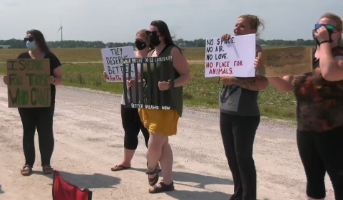 Protestors stand outside a property on Lions Club Road in Lakeshore, Ont. on Friday June 4, 2021 (Photo by CTV Windsor's Angelo Aversa)