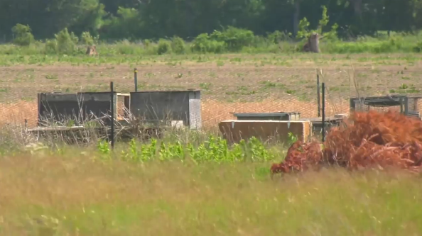 Shelters allegedly used to house dogs on a property on Lions Club Road in Lakeshore, Ont. on Friday June 6, 2021 (Photo by CTV Windsor's Angelo Aversa)
